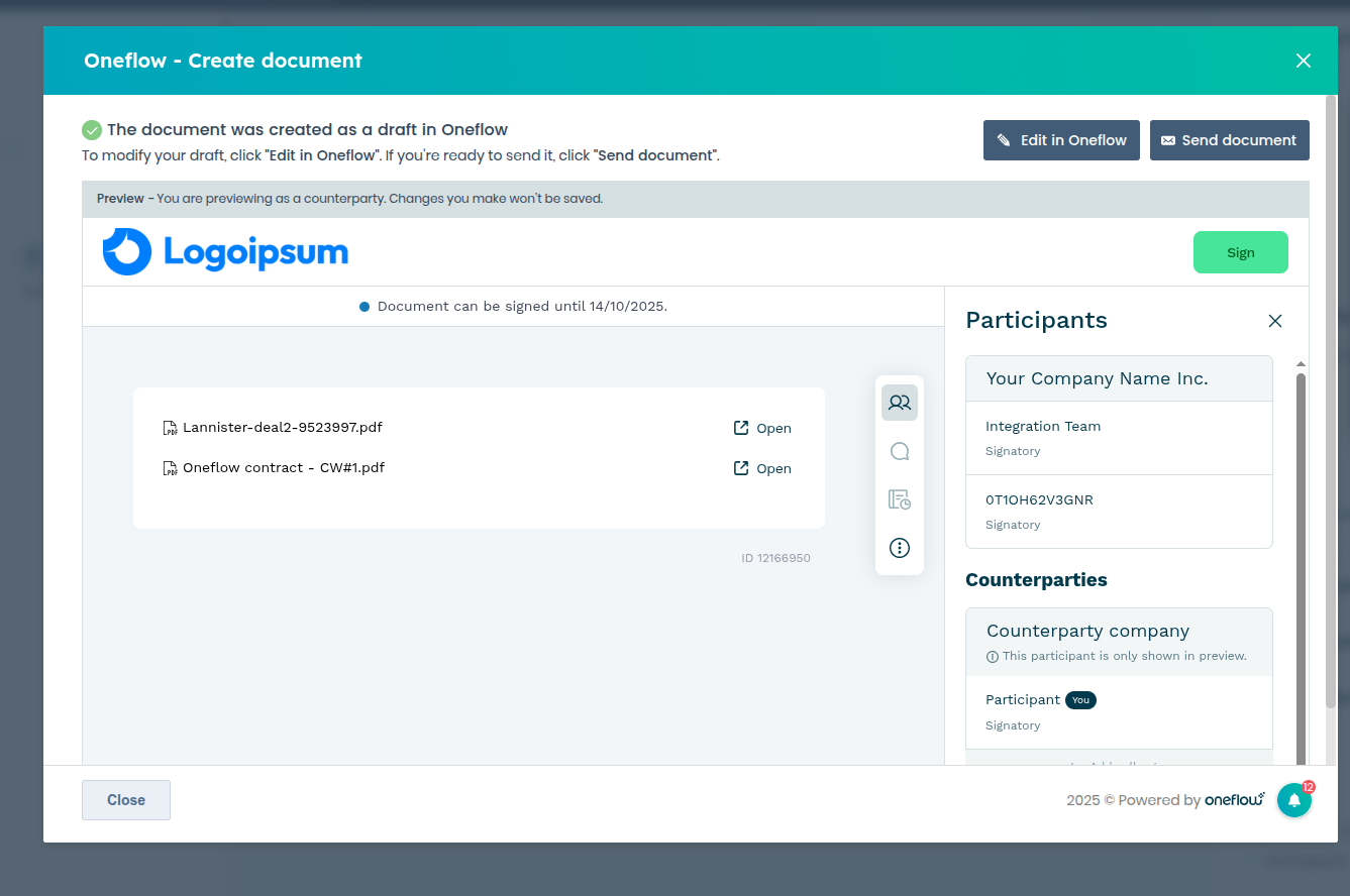 The Company will be added as the counterparty in the Oneflow contract. The Company Contacts and contact information specified in Step 2 will appear as the contract participants.