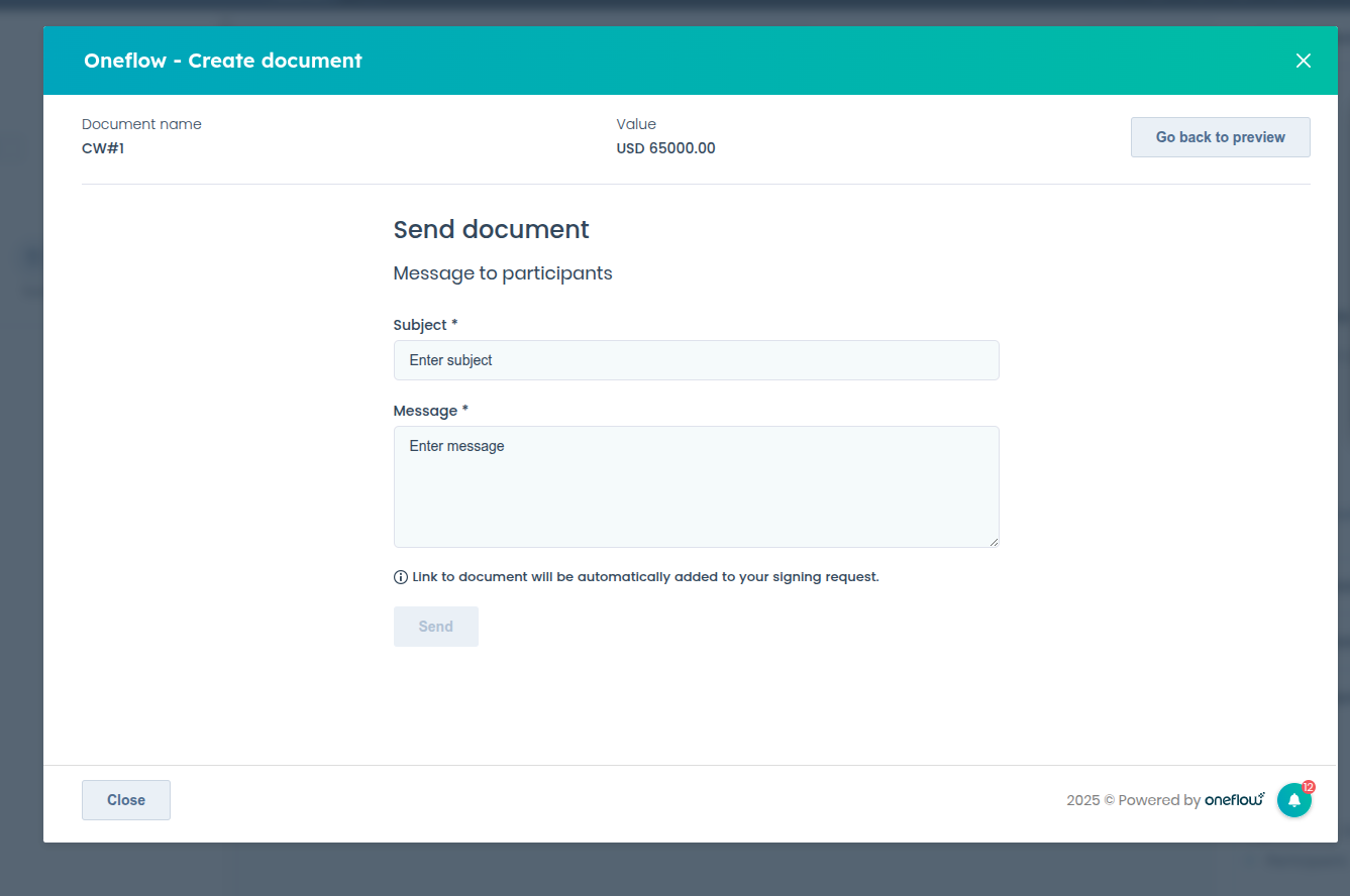 Once you click Create contract, a preview of your document will appear directly within HubSpot. If you are not logged in already to Oneflow, you will be asked to log in.