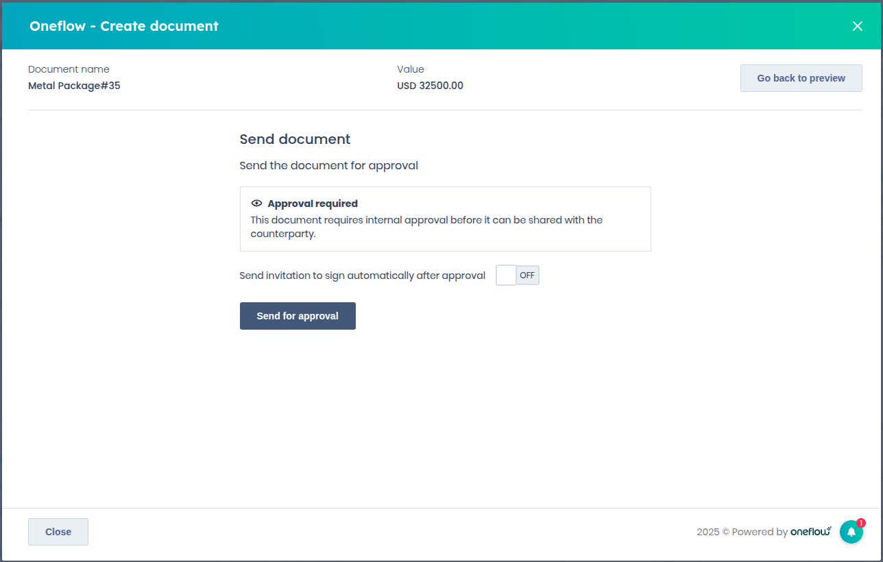 - If your template includes internal approvers, the document must first go through the approval process.
